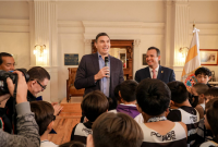 Durante un recorrido por el edificio de la Presidencia, los asistentes conocieron espacios emblemáticos como el Salón 12 de Octubre, el Salón de Cabildo y el Despacho del Presidente, donde el Alcalde les compartió pasajes sobre el origen de la ciudad y la relevancia histórica del recinto. Subrayó que el carácter del chihuahuense —noble, valiente y leal— debe inspirarlos a perseguir y alcanzar sus metas.