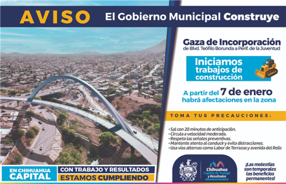 La obra implica la intervención de más de 700 metros lineales e incluye la construcción de una estructura metálica con tirantes de acero que sostendrá la gaza de dos carriles. Este proyecto se ejecuta de manera simultánea a otras dos grandes soluciones viales: los pasos superiores en la vialidad Los Nogales con avenida de las Industrias, y en la carretera Chihuahua-Aldama con avenida Fuerza Aérea.