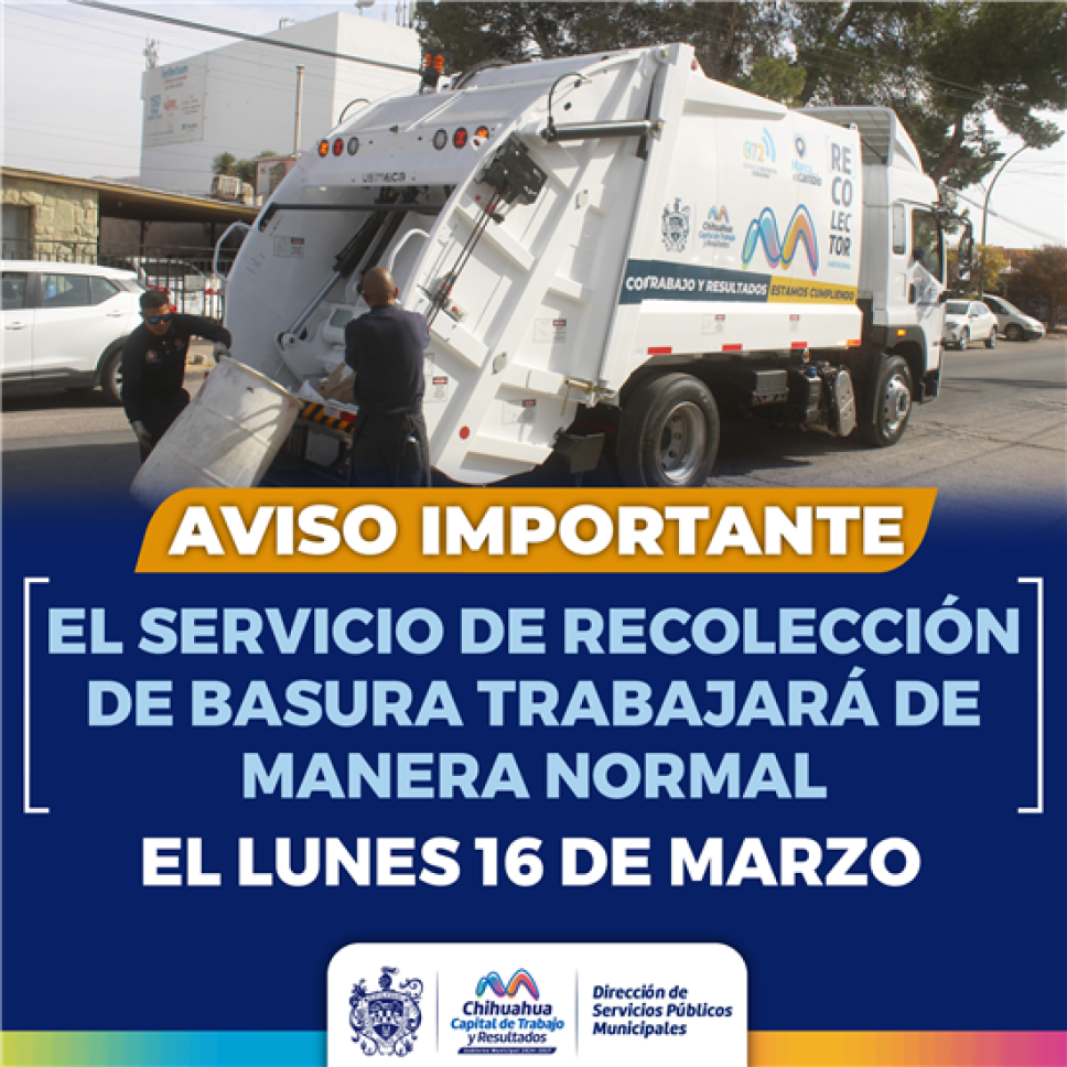El Gobierno Municipal informó que el servicio de recolección de basura habitacional trabajará de forma ordinaria este lunes 16 de marzo, a pesar del día inhábil por el natalicio de Benito Juárez. El relleno sanitario también operará en su horario regular para garantizar la limpieza en la capital.