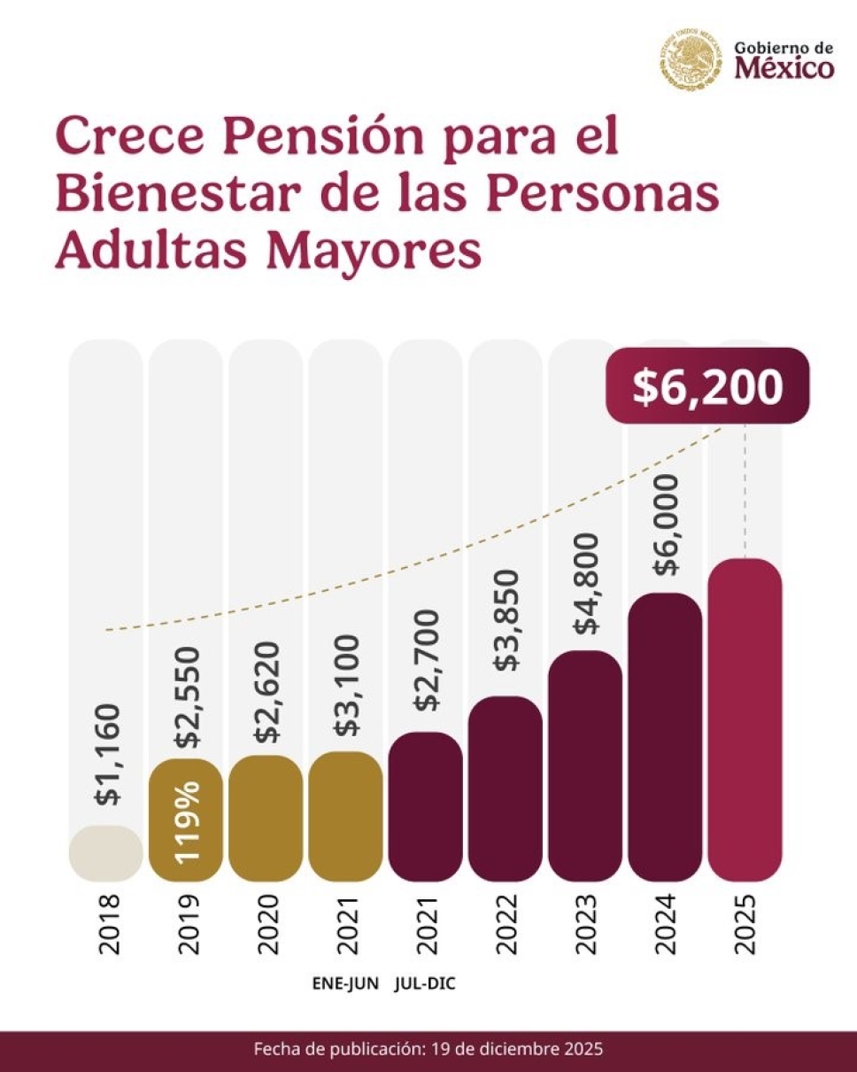 De acuerdo con datos oficiales, la pensión para personas de la tercera edad creció considerablemente en los últimos seis años, al elevarse de $1,160 pesos bimestrales en 2019 a $6,200 pesos en 2025.