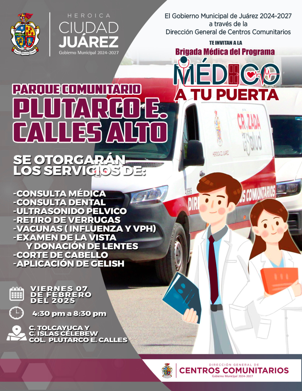El próximo viernes 7, la brigada estará en el Parque Comunitario Plutarco Elías Calles Alto, ubicado en la intersección de las calles Tolcayuca e Islas Célebes, en la colonia Plutarco Elías Calles. La atención se ofrecerá en un horario de 4:30 p. m. a 8:30 p. m.