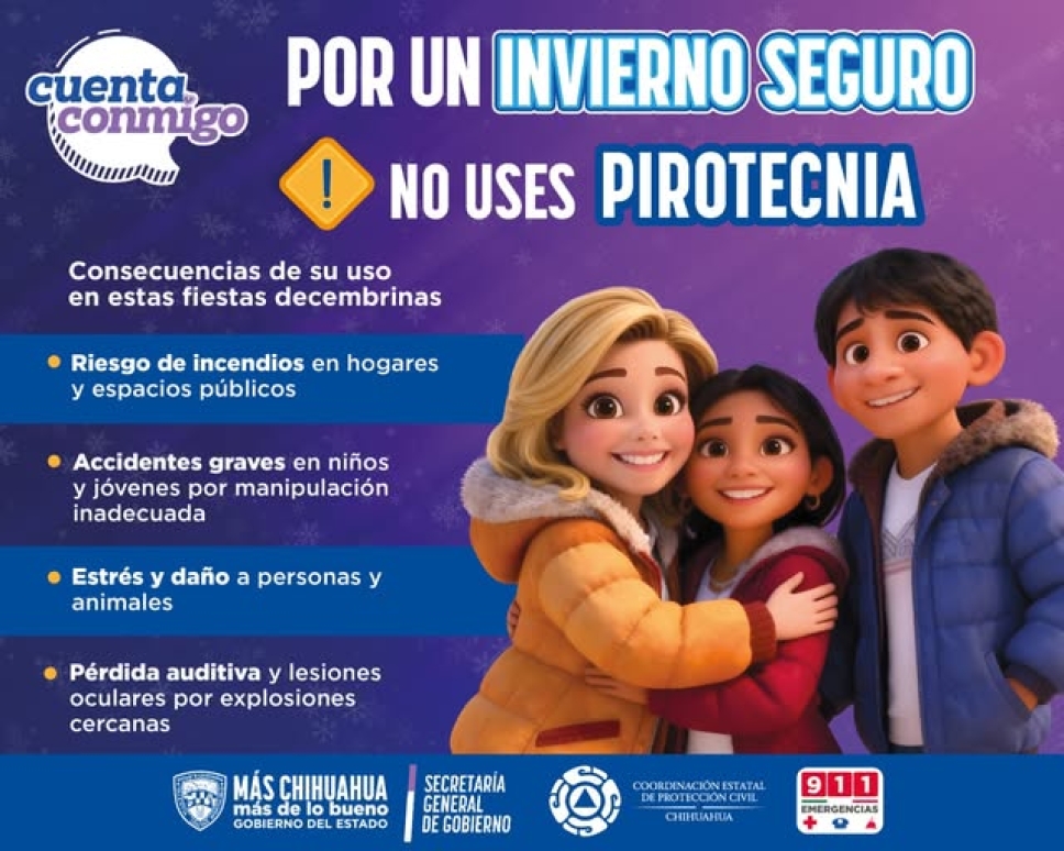 La Coordinación Estatal de Protección Civil de Chihuahua reiteró su exhorto a las familias chihuahuenses para no utilizar pirotecnia durante las celebraciones navideñas, al señalar que su uso representa un riesgo serio de accidentes y daños a la salud.
