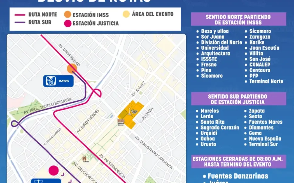 - Sentido Sur: El desvío comenzará desde la estación IMSS. El autobús tomará la vialidad Teófilo Borunda, continuará por la avenida Melchor Ocampo y se reincorporará a su ruta habitual en la estación Justicia.