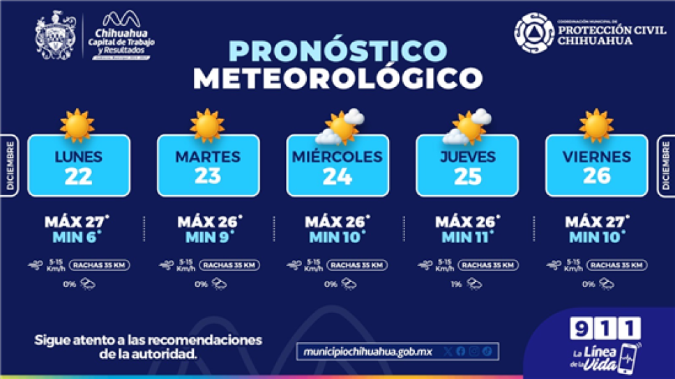 La Coordinación Municipal de Protección Civil informó que del lunes 22 al viernes 26 se esperan condiciones climáticas favorables en la capital del estado, con cielos mayormente despejados, baja nubosidad y ausencia de lluvias.