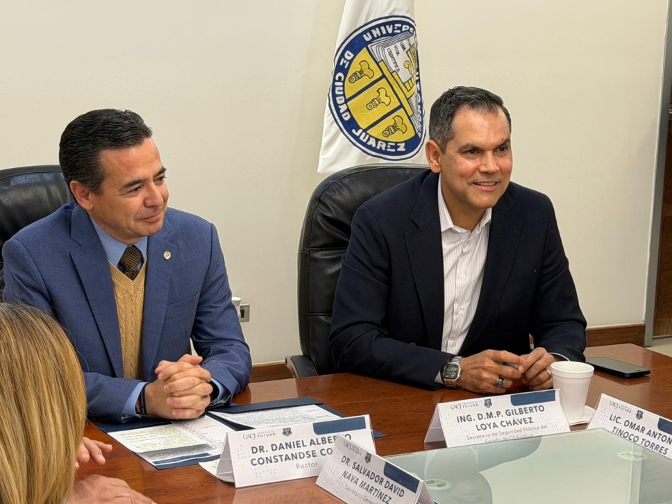La firma del acuerdo fue encabezada por el secretario de Seguridad Pública del Estado, Gilberto Loya, y se llevó a cabo al mediodía de este viernes en las instalaciones de la Rectoría de la UACJ, luego de una reunión de trabajo con el rector de la institución, Daniel Alberto Constandse Cortez.