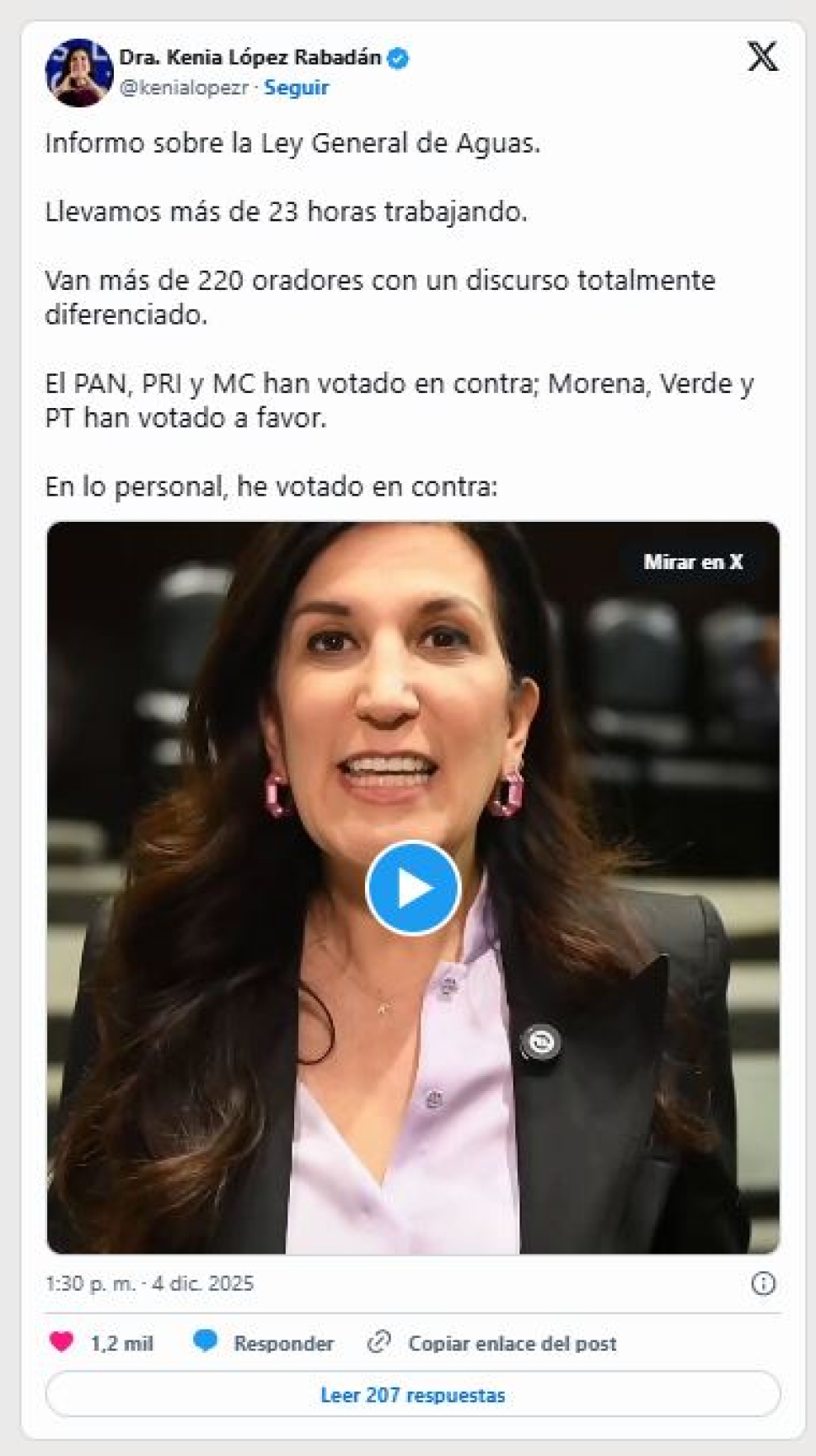 Durante la prolongada discusión sobre la Ley de Aguas en la Cámara de Diputados, la presidenta de la Mesa Directiva, Kenia López Rabadán, destacó la importancia de garantizar un proceso serio y abierto al diálogo. A través de un videomensaje publicado en sus redes sociales, informó que en las más de 23 horas de análisis se han registrado más de 220 participaciones, evidencia del interés y la magnitud del tema.