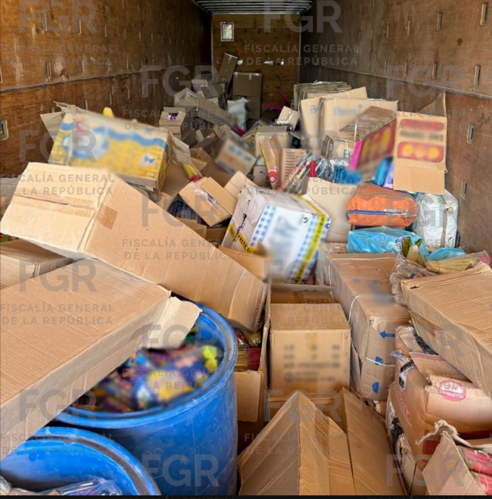 Durante labores de prevención y vigilancia, realizadas en coordinación con el Gabinete de Seguridad del Gobierno de México, los agentes aseguraron un semirremolque tipo caja seca, así como cinco mil 74 kilos con 900 gramos de material pirotécnico, consistente en artefactos de diversos tamaños y cuatro contenedores de plástico con mezclas de componentes utilizados para la elaboración de pólvora.