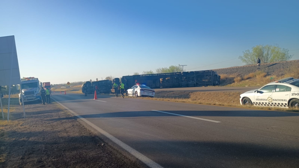 Un camión nodriza cargado con cinco vehículos procedentes de Estados Unidos volcó esta mañana en el kilómetro 120 del tramo Delicias-Saucillo, resultando en pérdidas materiales totales. El conductor fue atendido en el lugar por paramédicos, mientras elementos de la Guardia Nacional se hicieron cargo del siniestro que bloqueó parcialmente la vía.