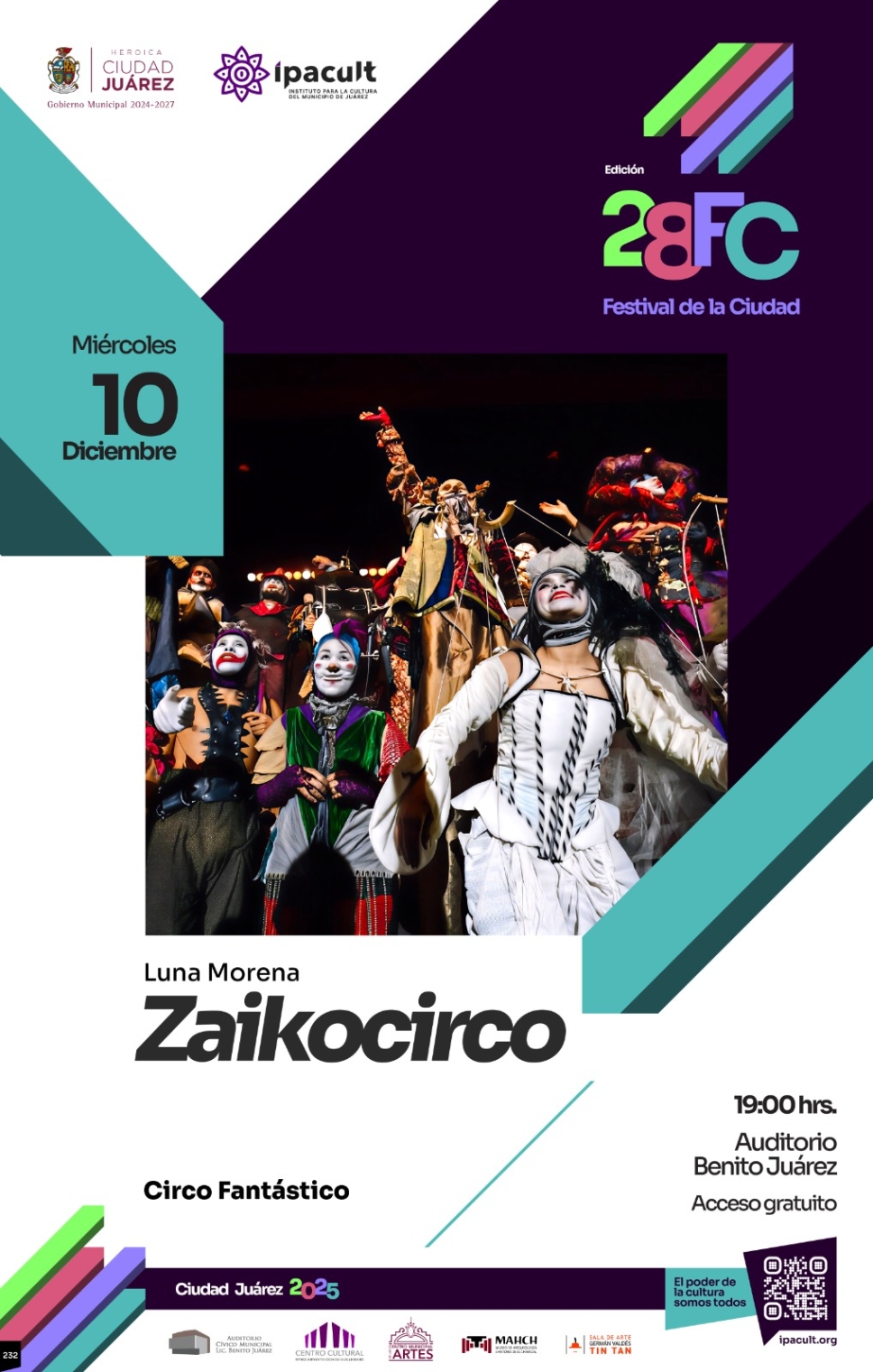 El Festival de la Ciudad, organizado por el Instituto para la Cultura del Municipio de Juárez (IPACULT), continúa con su programación artística y este miércoles 10 de diciembre presentará el espectáculo Zaikocirco, una propuesta que promete sorprender tanto a niñas como a niños y adultos con una visión fantástica del circo callejero.